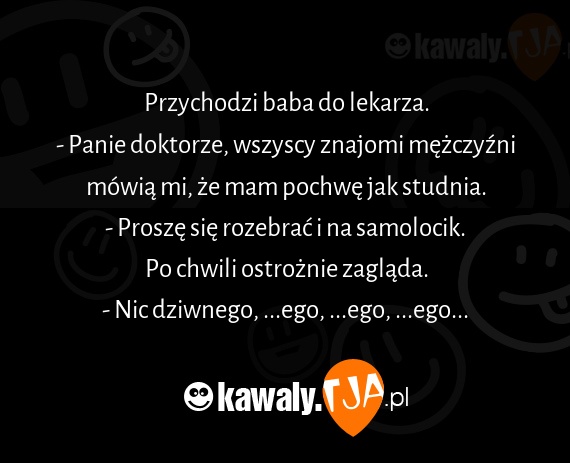 Przychodzi baba do lekarza. - Panie doktorze, wszyscy znajomi mężczyźni mówią mi, że mam pochwę jak studnia. - Proszę się rozebrać i na samolocik. Po chwili ostrożnie zagląda. - Nic dziwnego, ...ego, ...ego, ...ego...