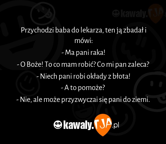 Przychodzi baba do lekarza, ten ją zbadał i mówi: - Ma pani raka! - O Boże! To co mam robić? Co mi pan zaleca? - Niech pani robi okłady z błota! - A to pomoże? - Nie, ale może przyzwyczai się pani do ziemi.