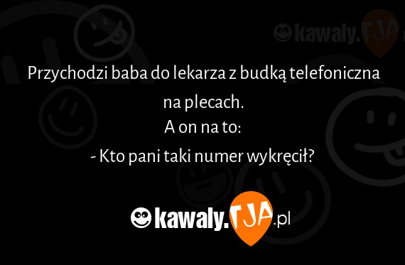 Przychodzi baba do lekarza z budką telefoniczna na plecach. A on na to: - Kto pani taki numer wykręcił?