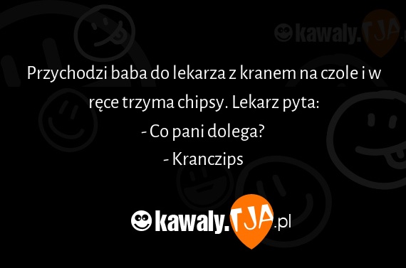 Przychodzi baba do lekarza z kranem na czole i w ręce trzyma chipsy. Lekarz pyta: - Co pani dolega? - Kranczips