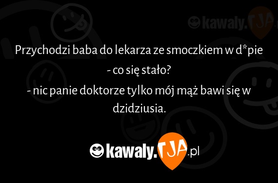 Przychodzi baba do lekarza ze smoczkiem w d*pie - co sie stalo? - nic panie doktorze tylko moj maz bawi sie w dzidziusia.