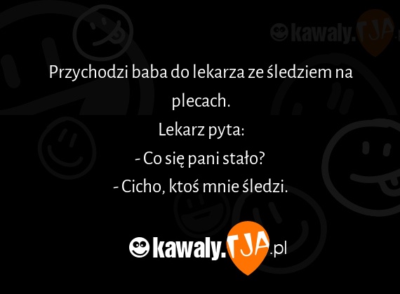 Przychodzi baba do lekarza ze sledziem na plecach. Lekarz pyta: - Co sie pani stalo? - Cicho, ktos mnie sledzi.