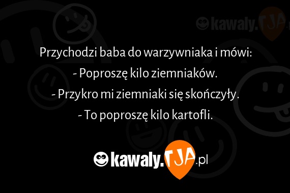 Przychodzi baba do warzywniaka i mowi: - Poprosze kilo ziemniakow. - Przykro mi ziemniaki sie skonczyly. - To poprosze kilo kartofli.