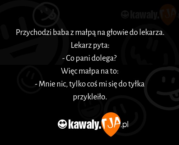 Przychodzi baba z małpą na głowie do lekarza. Lekarz pyta: - Co pani dolega? Więc małpa na to: - Mnie nic, tylko coś mi się do tyłka przykleiło.