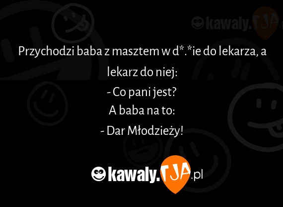 Przychodzi baba z masztem w d*.*ie do lekarza, a lekarz do niej: - Co pani jest? A baba na to: - Dar Młodzieży!