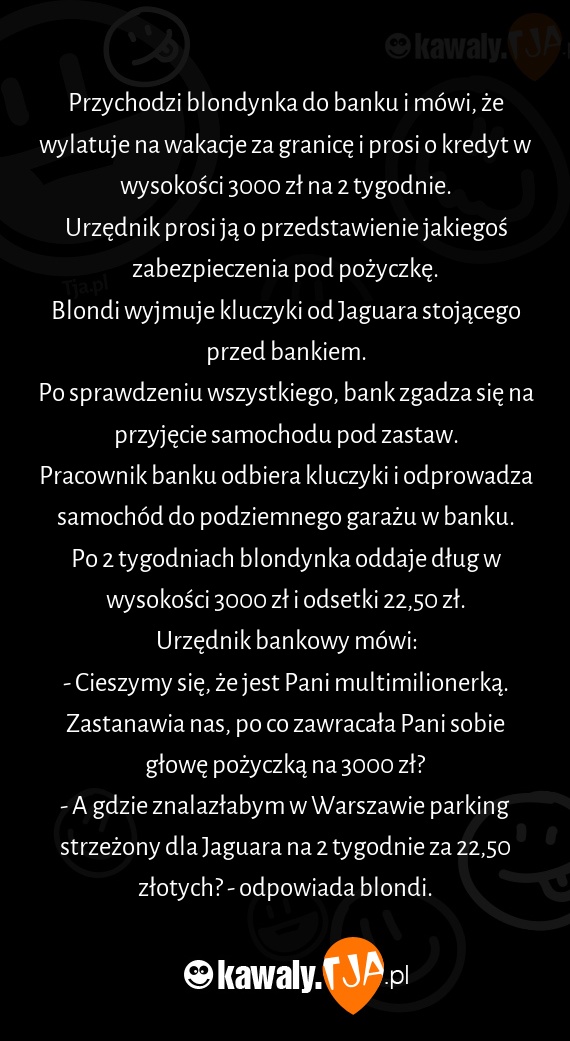 Przychodzi blondynka do banku i mówi, że wylatuje na wakacje za granicę i prosi o kredyt w wysokości 3000 zł na 2 tygodnie.