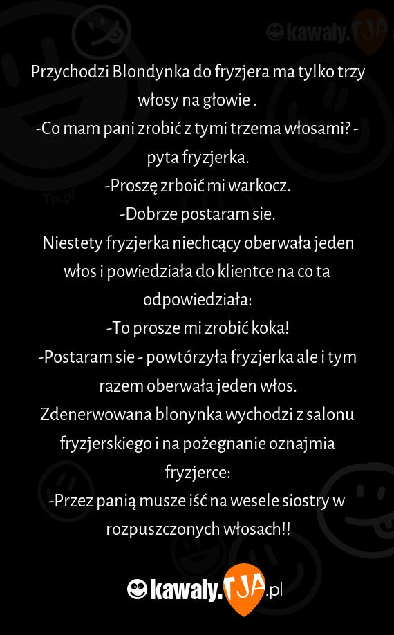 -Co mam pani zrobić z tymi trzema włosami? - pyta fryzjerka.