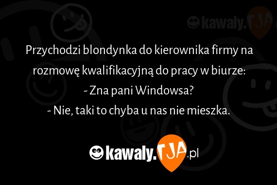 Przychodzi blondynka do kierownika firmy na rozmowe kwalifikacyjna do pracy w biurze: - Zna pani Windowsa? - Nie, taki to chyba u nas nie mieszka.
