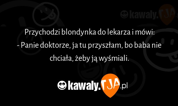 Przychodzi blondynka do lekarza i mówi: - Panie doktorze, ja tu przyszłam, bo baba nie chciała, żeby ją wyśmiali.
