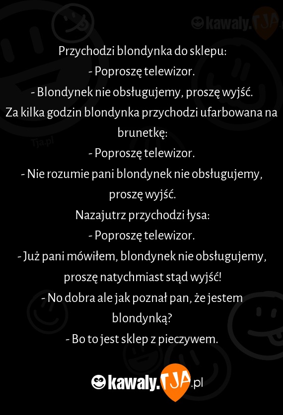 - Już pani mówiłem, blondynek nie obsługujemy, proszę natychmiast stąd wyjść!