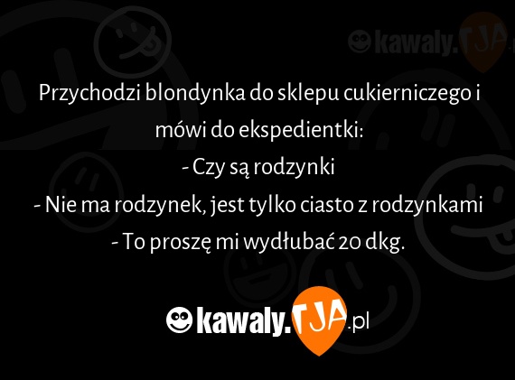 Przychodzi blondynka do sklepu cukierniczego i mowi do ekspedientki: - Czy sa rodzynki - Nie ma rodzynek, jest tylko ciasto z rodzynkami - To prosze mi wydlubac 20 dkg.