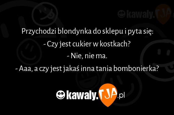 Przychodzi blondynka do sklepu i pyta się: - Czy jest cukier w kostkach? - Nie, nie ma. - Aaa, a czy jest jakaś inna tania bombonierka?