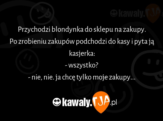 Przychodzi blondynka do sklepu na zakupy. Po zrobieniu zakupow podchodzi do kasy i pyta ja kasjerka: - wszystko? - nie, nie. ja chce tylko moje zakupy...