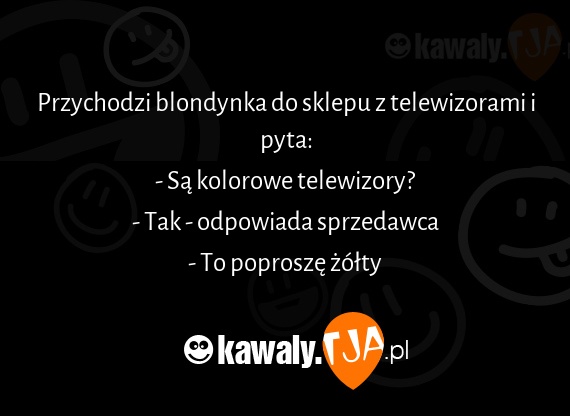 Przychodzi blondynka do sklepu z telewizorami i pyta: - Sa kolorowe telewizory? - Tak - odpowiada sprzedawca - To poprosze zolty