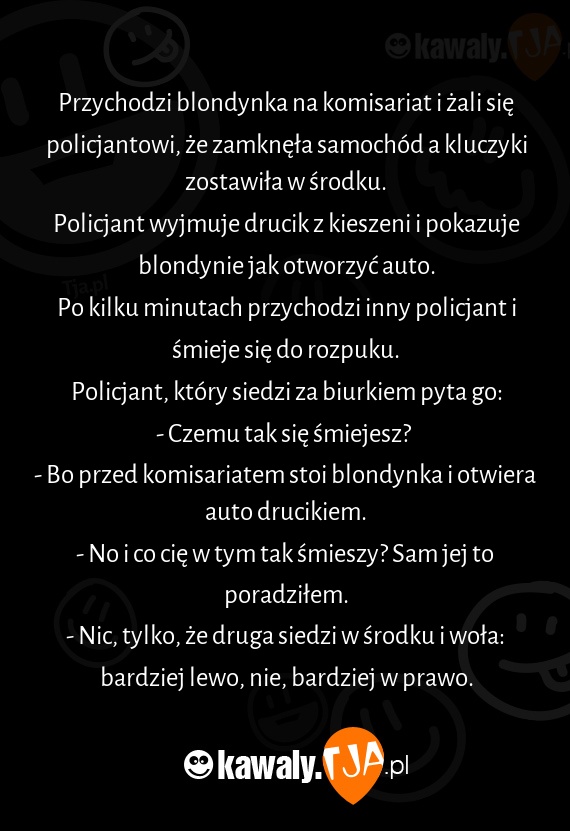 Przychodzi blondynka na komisariat i żali się policjantowi, że zamknęła samochód a kluczyki zostawiła w środku.