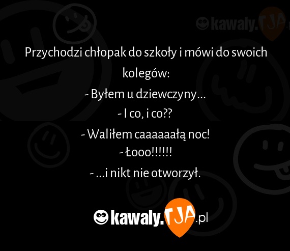 Przychodzi chłopak do szkoły i mówi do swoich kolegów: - Byłem u dziewczyny... - I co, i co?? - Waliłem caaaaaałą noc! - Łooo!!!!!! - ...i nikt nie otworzył.