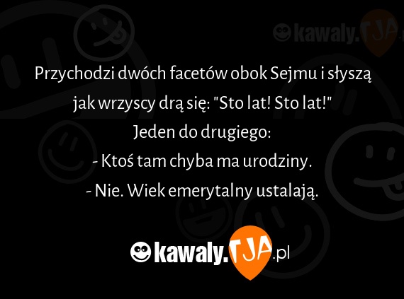 Przychodzi dwóch facetów obok Sejmu i słyszą jak wrzyscy drą się: "Sto lat! Sto lat!" Jeden do drugiego: - Ktoś tam chyba ma urodziny. - Nie. Wiek emerytalny ustalają.