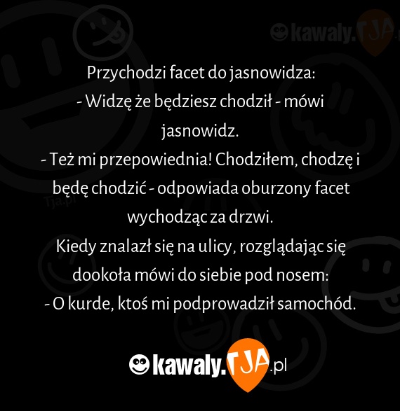 - Też mi przepowiednia! Chodziłem, chodzę i będę chodzić - odpowiada oburzony facet wychodząc za drzwi.