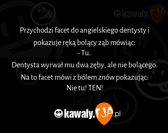 Przychodzi facet do angielskiego dentysty i pokazuje ręką bolący ząb mówiąc: - Tu. Dentysta wyrwał mu dwa zęby, ale nie bolącego. Na to facet mówi z bólem znów pokazując: Nie tu! TEN!