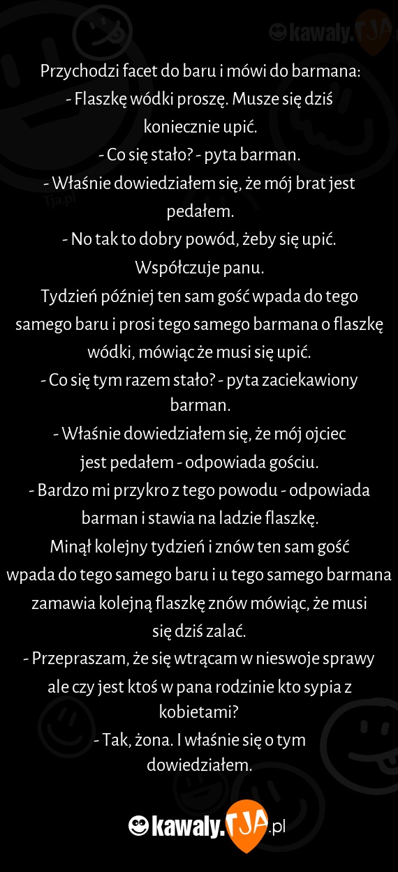 - Bardzo mi przykro z tego powodu - odpowiada barman i stawia na ladzie flaszkę.