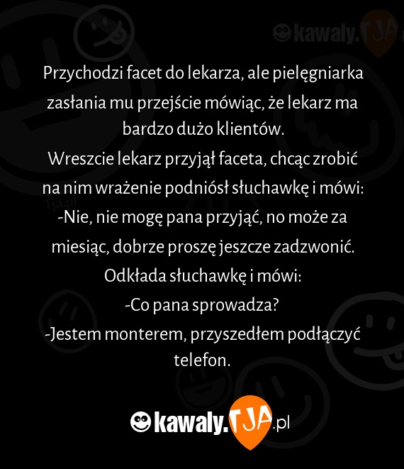 Wreszcie lekarz przyjął faceta, chcąc zrobić na nim wrażenie podniósł słuchawkę i mówi: