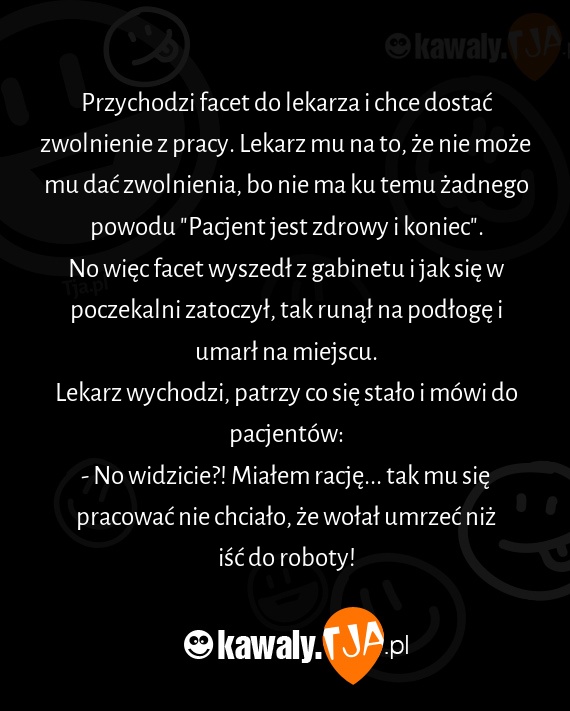 Przychodzi facet do lekarza i chce dostać zwolnienie z pracy. Lekarz mu na to, że nie może mu dać zwolnienia, bo nie ma ku temu żadnego powodu "Pacjent jest zdrowy i koniec".