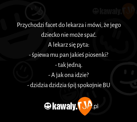 Przychodzi facet do lekarza i mowi, ze jego dziecko nie moze spac. A lekarz sie pyta: - spiewa mu pan jakies piosenki? - tak jedna. - A jak ona idzie? - dzidzia dzidzia spij spokojnie BU