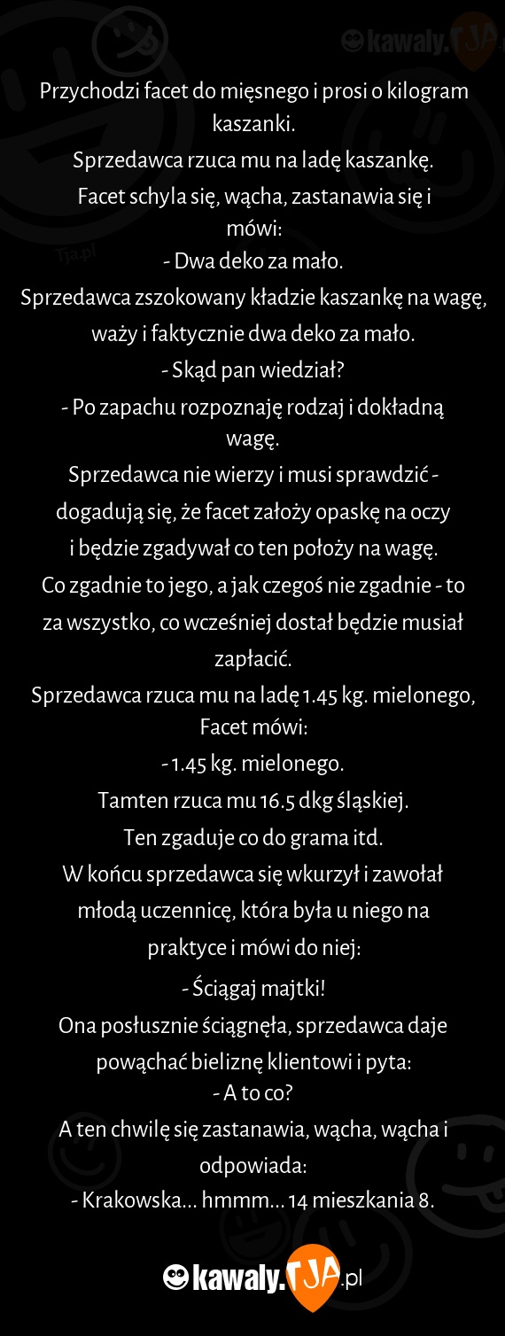 Sprzedawca zszokowany kładzie kaszankę na wagę, waży i faktycznie dwa deko za mało.