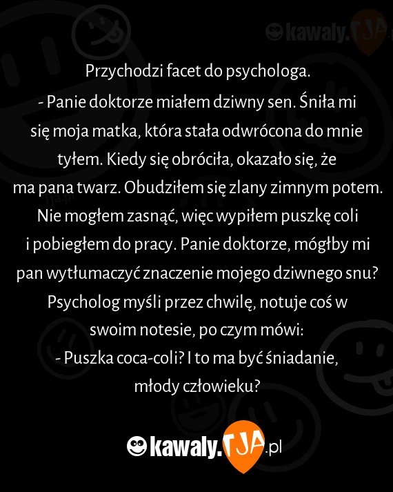 - Panie doktorze miałem dziwny sen. Śniła mi się moja matka, która stała odwrócona do mnie tyłem. Kiedy się obróciła, okazało się, że ma pana twarz. Obudziłem się zlany zimnym potem. Nie mogłem zasnąć, więc wypiłem puszkę coli i pobiegłem do pracy. Panie doktorze, mógłby mi pan wytłumaczyć znaczenie mojego dziwnego snu?