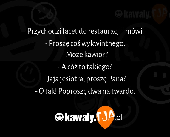 Przychodzi facet do restauracji i mówi: - Proszę coś wykwintnego. - Może kawior? - A cóż to takiego? - Jaja jesiotra, proszę Pana? - O tak! Poproszę dwa na twardo.