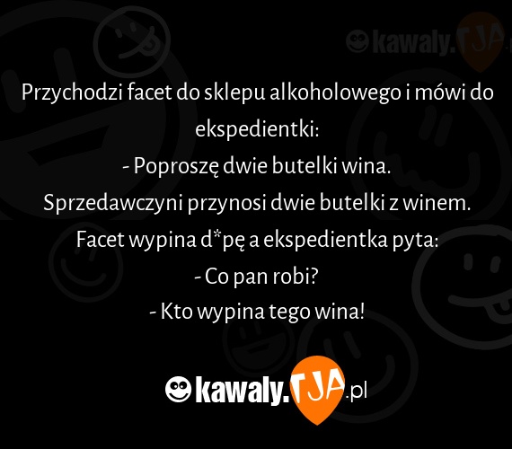 Przychodzi facet do sklepu alkoholowego i mowi do ekspedientki: - Poprosze dwie butelki wina. Sprzedawczyni przynosi dwie butelki z winem. Facet wypina dupe a ekspedientka pyta: - Co pan robi? - Kto wypina tego wina!