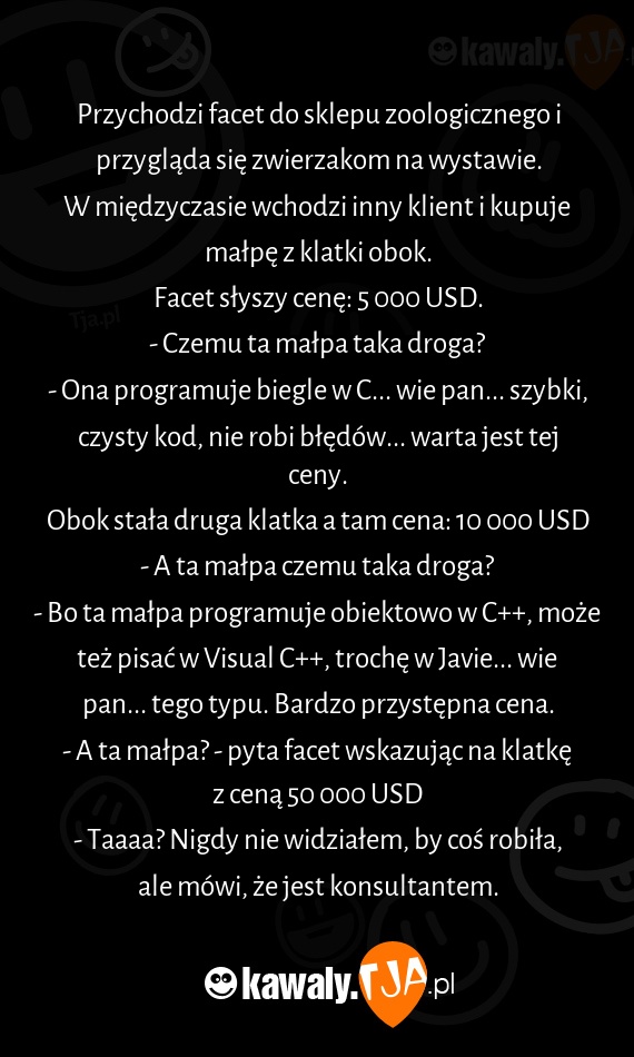- Bo ta małpa programuje obiektowo w C++, może też pisać w Visual C++, trochę w Javie... wie pan... tego typu. Bardzo przystępna cena.