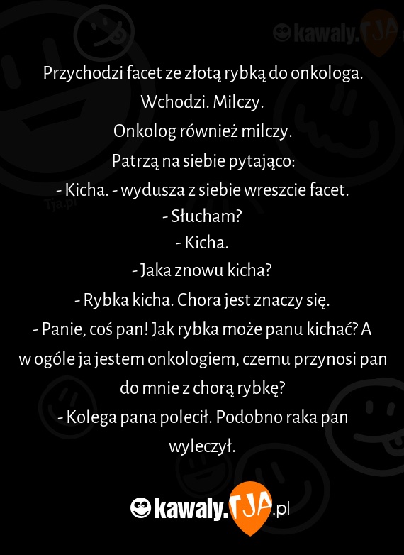 - Panie, coś pan! Jak rybka może panu kichać? A w ogóle ja jestem onkologiem, czemu przynosi pan do mnie z chorą rybkę?