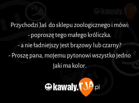 Przychodzi Jas do sklepu zoologicznego i mowi: - poprosze tego malego kroliczka. - a nie ladniejszy jest brazowy lub czarny? - Prosze pana, mojemu pytonowi wszystko jedno jaki ma kolor.