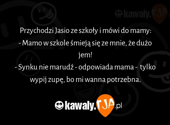 Przychodzi Jasio ze szkoły i mówi do mamy: - Mamo w szkole śmieją się ze mnie, że dużo jem! - Synku nie marudź - odpowiada mama - tylko wypij zupę, bo mi wanna potrzebna.