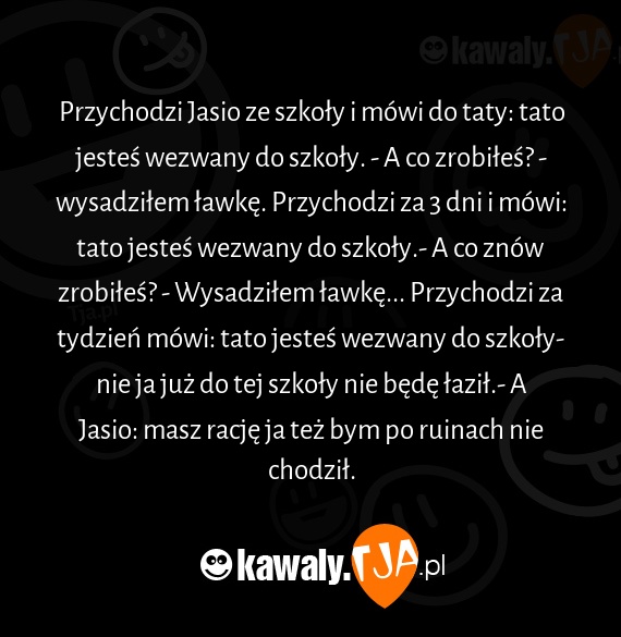 Przychodzi Jasio ze szkoły i mówi do taty: tato jesteś wezwany do szkoły. - A co zrobiłeś? - wysadziłem ławkę. Przychodzi za 3 dni i mówi: tato jesteś wezwany do szkoły.- A co znów zrobiłeś? - Wysadziłem ławkę... Przychodzi za tydzień mówi: tato jesteś wezwany do szkoły- nie ja już do tej szkoły nie będę łaził.- A Jasio: masz rację ja też bym po ruinach nie chodził.