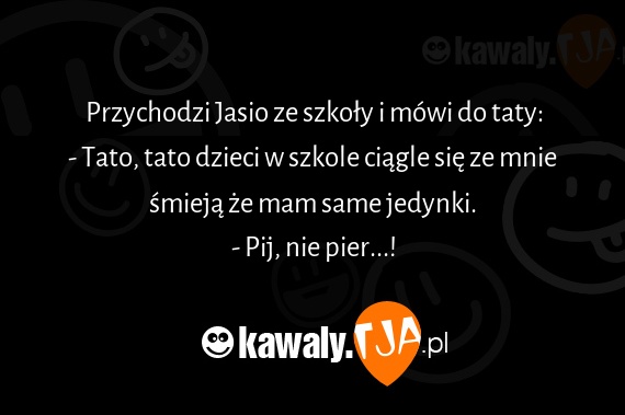 Przychodzi Jasio ze szkoly i mowi do taty: - Tato, tato dzieci w szkole ciagle sie ze mnie smieja ze mam same jedynki. - Pij, nie pier...!