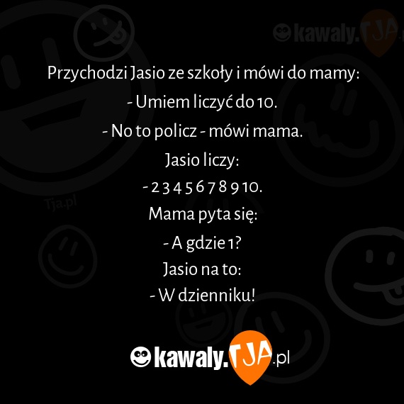 Przychodzi Jasio ze szkoły i mówi do mamy: - Umiem liczyć do 10. - No to policz - mówi mama. Jasio liczy: - 2 3 4 5 6 7 8 9 10. Mama pyta się: - A gdzie 1? Jasio na to: - W dzienniku!