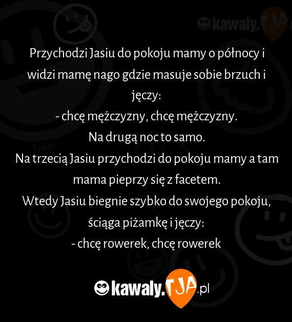 Przychodzi Jasiu do pokoju mamy o północy i widzi mamę nago gdzie masuje sobie brzuch i jęczy: