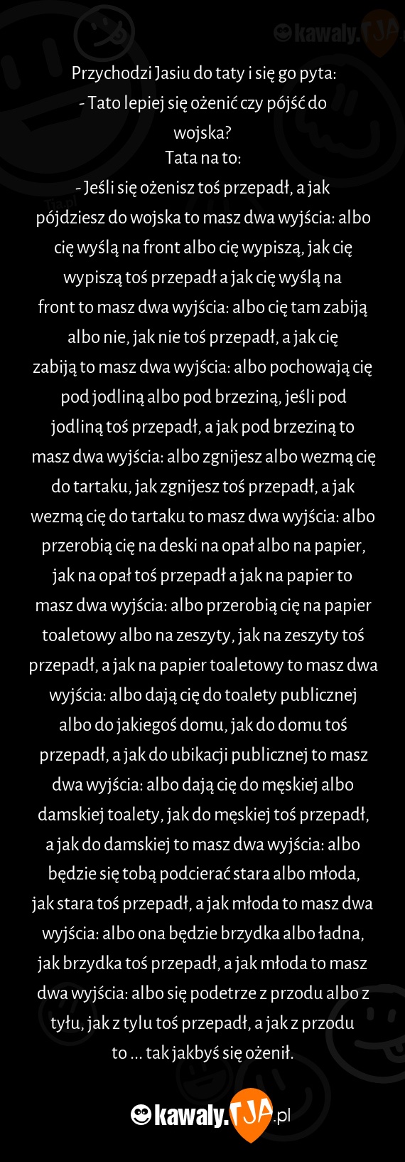 - Jeśli się ożenisz toś przepadł, a jak pójdziesz do wojska to masz dwa wyjścia: albo cię wyślą na front albo cię wypiszą, jak cię wypiszą toś przepadł a jak cię wyślą na front to masz dwa wyjścia: albo cię tam zabiją albo nie, jak nie toś przepadł, a jak cię zabiją to masz dwa wyjścia: albo pochowają cię pod jodliną albo pod brzeziną, jeśli pod jodliną toś przepadł, a jak pod brzeziną to masz dwa wyjścia: albo zgnijesz albo wezmą cię do tartaku, jak zgnijesz toś przepadł, a jak wezmą cię do tartaku to masz dwa wyjścia: albo przerobią cię na deski na opał albo na papier, jak na opał toś przepadł a jak na papier to masz dwa wyjścia: albo przerobią cię na papier toaletowy albo na zeszyty, jak na zeszyty toś przepadł, a jak na papier toaletowy to masz dwa wyjścia: albo dają cię do toalety publicznej albo do jakiegoś domu, jak do domu toś przepadł, a jak do ubikacji publicznej to masz dwa wyjścia: albo dają cię do męskiej albo damskiej toalety, jak do męskiej toś przepadł, a jak do damskiej to masz dwa wyjścia: albo będzie się tobą podcierać stara albo młoda, jak stara toś przepadł, a jak młoda to masz dwa wyjścia: albo ona będzie brzydka albo ładna, jak brzydka toś przepadł, a jak młoda to masz dwa wyjścia: albo się podetrze z przodu albo z tyłu, jak z tylu toś przepadł, a jak z przodu to ... tak jakbyś się ożenił.