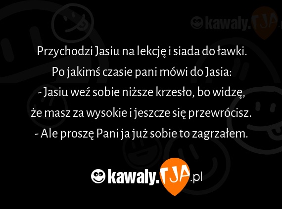 Przychodzi Jasiu na lekcje i siada do lawki. Po jakims czasie pani mowi do Jasia: - Jasiu wex sobie nizsze krzeslo, bo widze, ze masz za wysokie i jeszcze sie przewrocisz. - Ale prosze Pani ja juz sobie to zagrzalem.