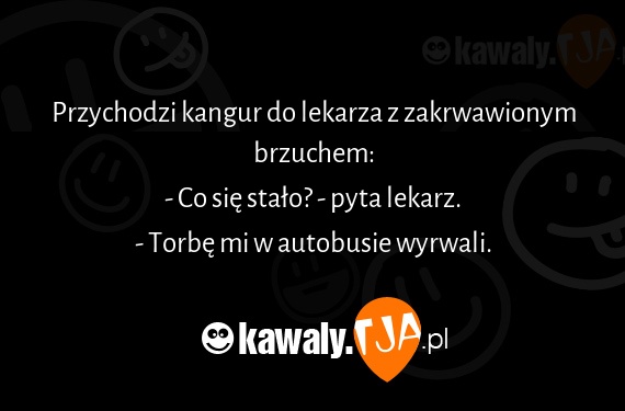 Przychodzi kangur do lekarza z zakrwawionym brzuchem: - Co się stało? - pyta lekarz. - Torbę mi w autobusie wyrwali.