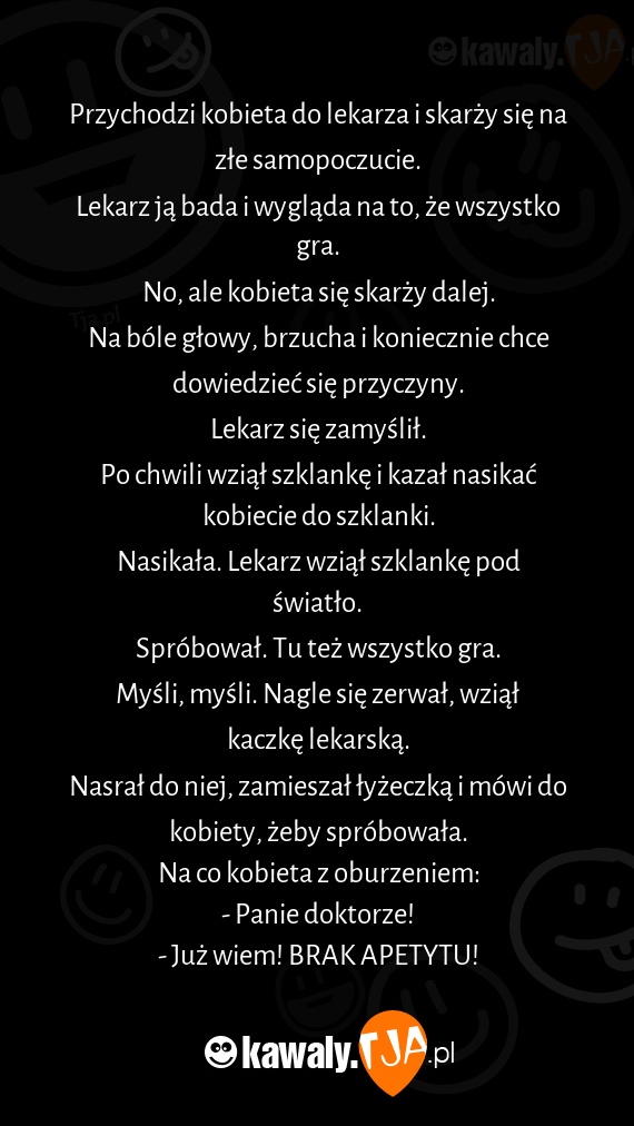 Przychodzi kobieta do lekarza i skarży się na złe samopoczucie.
