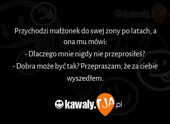 Przychodzi małżonek do swej zony po latach, a ona mu mówi: - Dlaczego mnie nigdy nie przeprosiłeś? - Dobra może być tak? Przepraszam, że za ciebie wyszedłem.