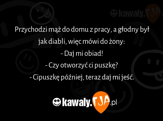Przychodzi mąż do domu z pracy, a głodny był jak diabli, więc mówi do żony: - Daj mi obiad! - Czy otworzyć ci puszkę? - Cipuszkę później, teraz daj mi jeść.