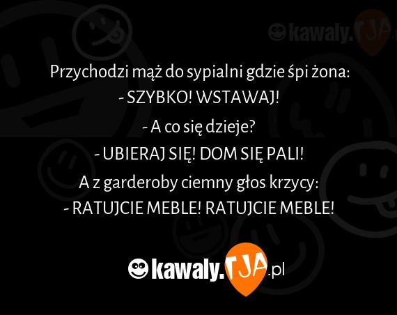 Przychodzi mąż do sypialni gdzie śpi żona: - SZYBKO! WSTAWAJ! - A co się dzieje? - UBIERAJ SIĘ! DOM SIĘ PALI! A z garderoby ciemny głos krzycy: - RATUJCIE MEBLE! RATUJCIE MEBLE!