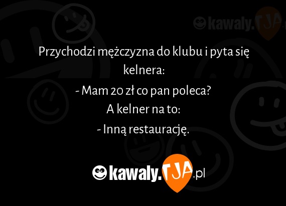 Przychodzi mezczyzna do klubu i pyta sie kelnera: - Mam 20 zl co pan poleca? A kelner na to: - Inna restauracje.