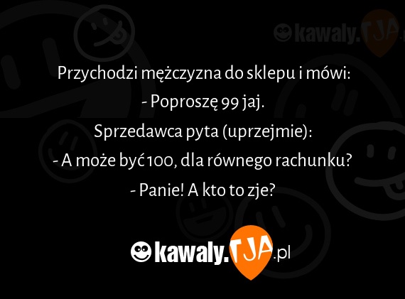 Przychodzi mezczyzna do sklepu i mowi: - Poprosze 99 jaj. Sprzedawca pyta (uprzejmie): - A moze byc 100, dla rownego rachunku? - Panie! A kto to zje?