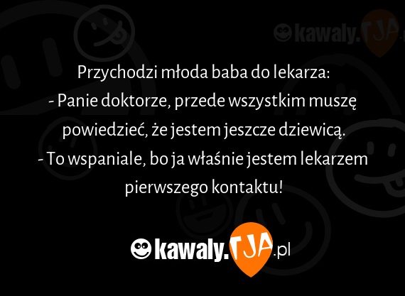 Przychodzi mloda baba do lekarza: - Panie doktorze, przede wszystkim musze powiedziec, ze jestem jeszcze dziewica. - To wspaniale, bo ja wlasnie jestem lekarzem pierwszego kontaktu!