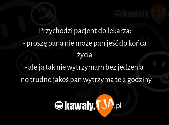 Przychodzi pacjent do lekarza: - prosze pana nie moze pan jesc do konca zycia - ale ja tak nie wytrzymam bez jedzenia - no trudno jakos pan wytrzyma te 2 godziny